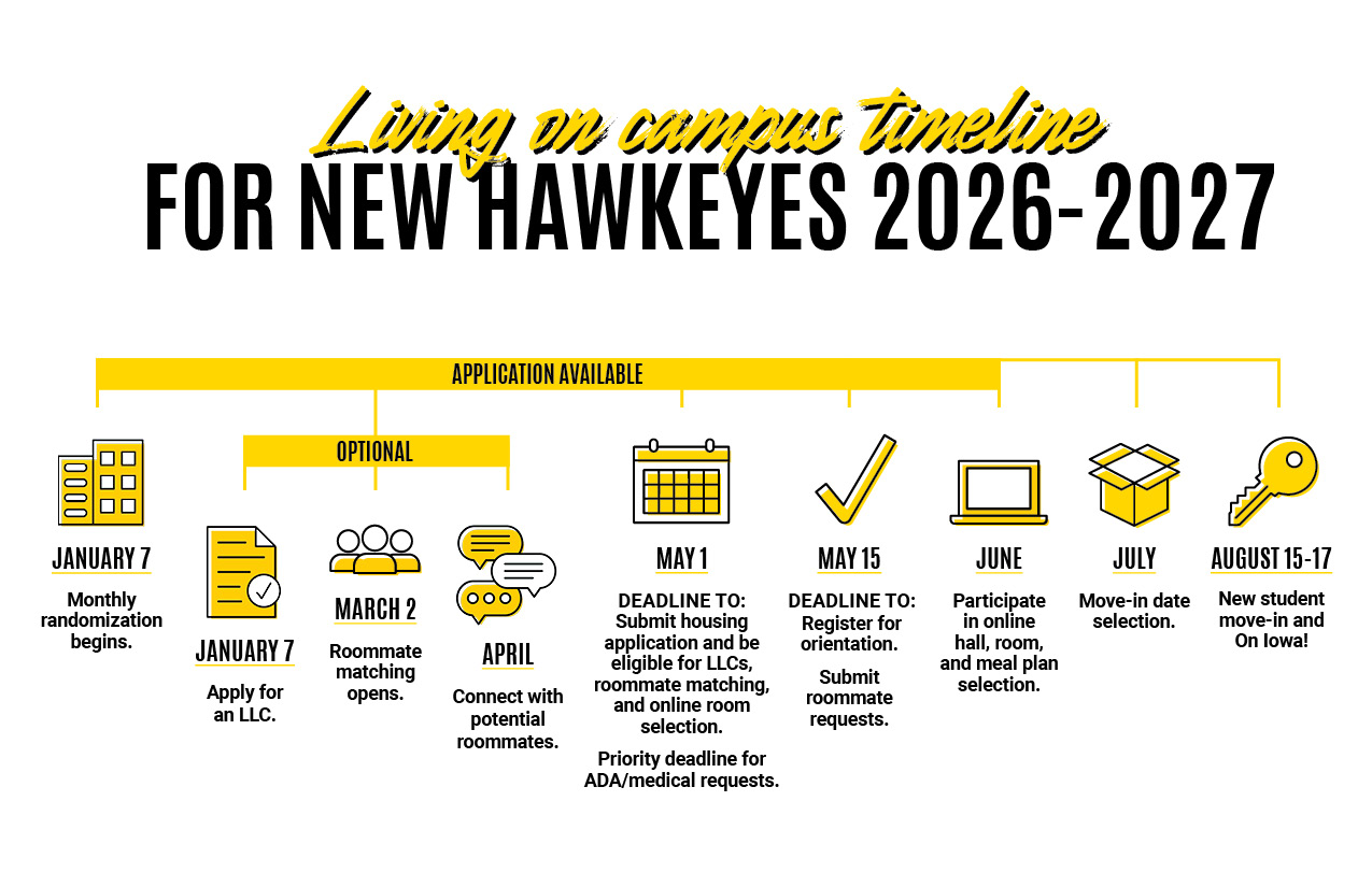 We're excited to welcome you to the University of Iowa! If you have been admitted to Iowa and will be 16 years of age by Aug. 1, 2026, you can apply for housing in the residence halls. You do not need to accept your admission to the University of Iowa in order to apply for housing. You can submit your application as you finalize your decision to become a Hawkeye.